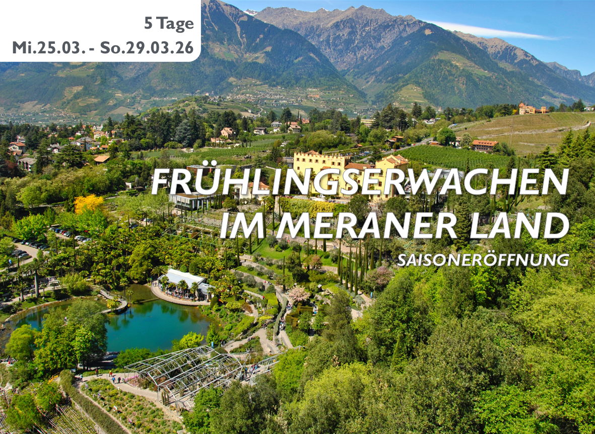 Der Vormittag dreht sich um die Kurstadt Meran. Bei einem geführten Stadtrundgang lernen Sie die Schönheiten der historischen Stadt kennen, schlendern durch malerische Gassen und genießen das mediterrane Flair. Am Nachmittag steht mit dem Besuch in den Gärten von Schloss Trauttmansdorff ein ganz besonderes Naturerlebnis an. Hier finden Sie die ganze Welt in einem Garten wieder, denn neben einheimischen Pflanzen gedeihen dort auch viele Gewächse, die im Mittelmeerraum oder in Asien beheimatet sind. Zum Ausklingen des Tages wartet im Schloss Rametz, direkt neben den Gärten, noch eine Weinprobe auf Sie, also lassen Sie es sich gut gehen! Mit dem neuen Wissen und dem gelöschten Durst fahren Sie zurück ins Hotel, wo das Abendessen bereits auf Sie wartet.